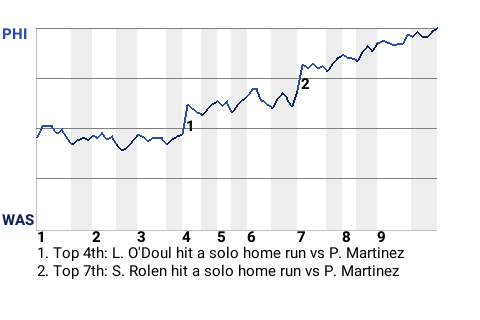 Philadelphia took a 2-0 lead on Scott Rolen's 8th home run of the season. The solo home run, which Rolen hit in the top of the seventh, left Washington pitcher Pedro J Martinez visibly frustrated.