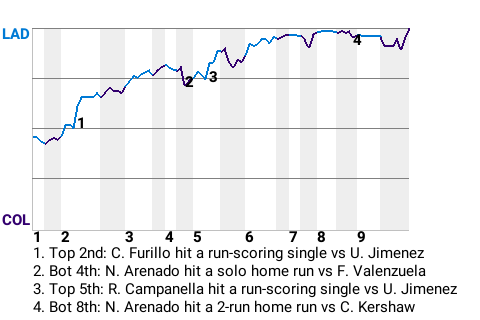 The Los Angeles Dodgers withstood an impressive performance by Colorado third baseman Nolan Arenado to defeat the Rockies, 7-4, at Coors Field. Arenado went 2 for 4 with 2 home runs, while adding 3 RBI and scoring twice. The loss makes Colorado 20-41.