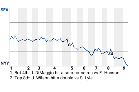 The Mariners had been locked in a 0-0 tie with the Yankees going into the bottom of the fourth inning. That changed quickly when the 22-year old left fielder Joe DiMaggio came to the plate. DiMaggio hit a solo home run on a 0-2 curveball from Seattle hurler Erik Hanson. It was DiMaggio's 6th home run of the year.