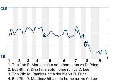 Tampa Bay took the lead, 2-1, on Dave Martinez's 2nd home run of the season. The solo home run came off Cleveland pitcher Cliff P Lee in the bottom of the seventh.
