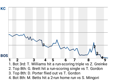 Ted Williams had a big run-scoring triple for the Red Sox in the bottom of the third inning. With Boston leading 1-0 and a runner on 1st, he got a curveball from 25-year old right-handed pitcher Zack Greinke and swatted a triple to right-center. It was his 3rd triple of the season, and more importantly, it put the Red Sox ahead, 2-0.