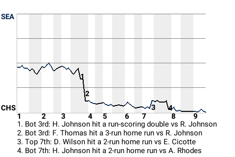 Frank E Thomas had a big 3-run home run for the White Sox in the bottom of the third inning. With Chicago leading 1-0 and runners on 1st and 2nd, he got a curveball from Randy D Johnson and swatted a home run to left-center. It was his 2nd home run of the season, and more importantly, it put the White Sox ahead, 4-0.