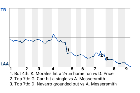 The Angels got a big at-bat from first baseman Kendry Morales. For the game, Morales went 1-3 with a home run, while adding 2 RBI and scoring once. In the bottom of the fourth, with a runner on 2nd, he stroked a 2-run home run. His 6th home run of the season gave Los Angeles a 2-0 lead.