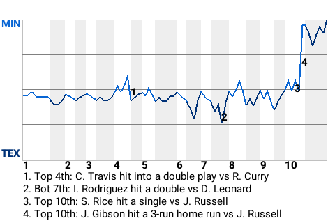 Josh Gibson came through with a big-time hit for Minnesota. The designated hitter smacked a 3-run home run in the top of the tenth inning to give his team the lead, 3-0. It was his only hit, but it was clutch.