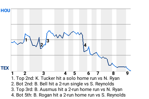 In the bottom of the 2nd, Texas took the lead on a 2-run single by Buddy Bell. At the time, the Rangers were trailing 1-0, but Bell's hit with two outs against Houston pitcher Shane Reynolds put them in front, 2-1.