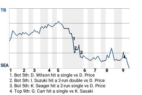 Tied up with the Rays in the bottom of the fifth inning, the Mariners got a boost from third baseman Kyle Seager. With the bases loaded, Seager saw a first pitch fastball from David Price and hit a 2-run single to break the stalemate and put Seattle on top, 4-2.