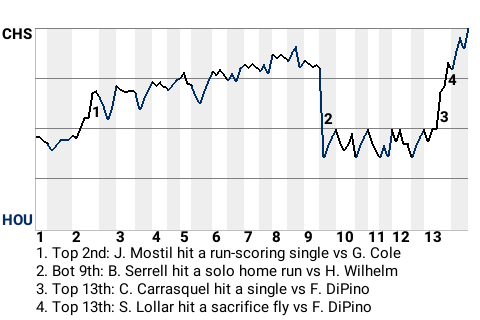 Sherm Lollar had a direct impact on the outcome. Lollar contributed a run-scoring sacrifice fly in the top of the 13th inning to put Chicago up, 3-2.