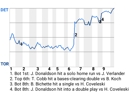 Detroit used the clutch hitting of Ty Cobb to capture the win. The center fielder drilled a bases-clearing double in the top of the sixth inning to give the Tigers the lead, 3-1. For the game, Cobb had 1 single and 1 double in 4 at-bats.