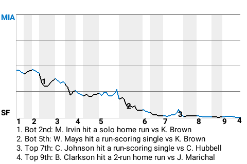 The San Francisco Giants picked up a win at AT&T Park, dropping the Miami Marlins, 6-3. Carl Hubbell was the difference-maker. The winner was Hubbell. He threw 6.1 innings of 5-hit ball. The loser was Kevin Brown. The win gives San Francisco a record of 1-1.