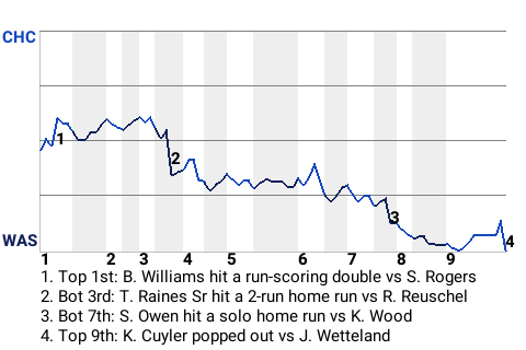 Washington Nationals starter Steve Rogers was in a rhythm all game. He led his team to a win over the Chicago Cubs, 4-2. Rogers yielded 1 run over 6.2 innings to notch the win. He scattered 4 hits, walked 2, and struck out 5. His record improves to 1-0. The loss drops Chicago to 1-2.