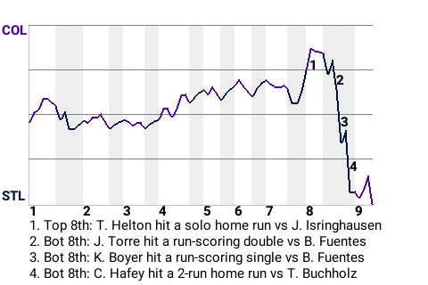 St. Louis took a 5-3 lead on Chick Hafey's 1st home run of the season. The 2-run home run, which Hafey hit in the bottom of the eighth, left Colorado pitcher Taylor Buchholz visibly frustrated.