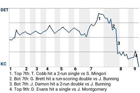 Kansas City took a 4-3 lead on Johnny Damon's 1st double of the season. The 2-run double, which Damon hit in the bottom of the seventh, left Detroit pitcher Jim Bunning visibly frustrated.