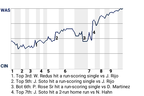 The Washington Nationals dealt the Cincinnati Reds a 5-3 loss at Great American Ball Park. Juan Soto was the star on offense. He went 3-4 with a home run, 2 singles, and a walk. He drove in 3 runs and scored once. Washington pitcher Dennis Martinez got the win, upping his record to 1-0. Noodles Hahn got the loss. With the loss, Cincinnati is 3-4.