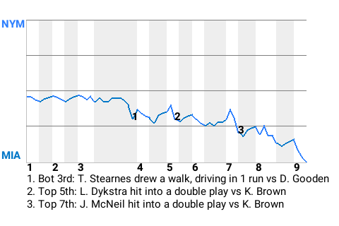 Kevin Brown came out firing strikes and, when the game ended, the Miami Marlins hurler had struck out 9, leading Miami past the New York Mets, 1-0. Brown allowed just 2 hits in the ballgame.