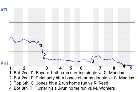 Ed Delahanty had a big bases-clearing double for the Phillies in the bottom of the second inning. With Philadelphia leading 1-0 and the bases loaded, he got a cutter from Greg Maddux and swatted a double to right. It was his 1st double of the season, and more importantly, it put the Phillies ahead, 4-0.