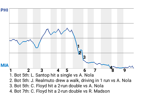 Marcell Ozuna drove in one run for Miami. The 26-year old left fielder had a key at-bat in the bottom of the fifth. With one out and the bases loaded, he broke a 1-1 tie with a run-scoring sacrifice fly off Aaron Nola. It was his 10th RBI of the season.