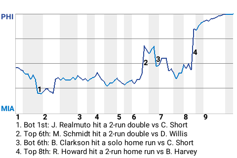 The Philadelphia Phillies knocked off the Miami Marlins, 10-4, at Marlins Ballpark. Ryan Howard was a big reason Philadelphia won. The first baseman was 3 for 5 with 2 home runs, while adding 6 RBI and scoring twice. With the loss, Miami is 9-9.