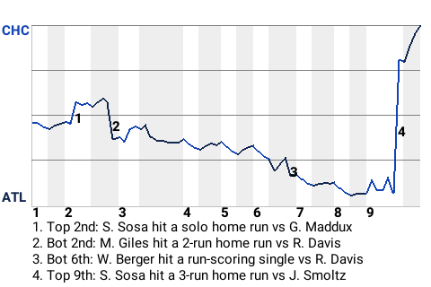 Sammy Sosa left his imprint on the 5-4 Chicago win against the Atlanta Braves. Sosa, who is tied for 4th in the NL in home runs with 8, belted 2 home runs, while adding 4 RBI and scoring twice. The loss drops Atlanta to 10-14.