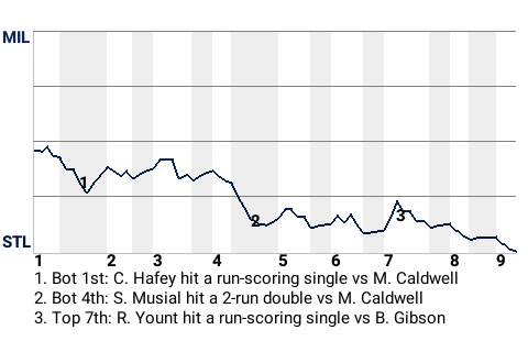 Stan Musial had a big 2-run double for the Cardinals in the bottom of the fourth inning. With St. Louis leading 1-0 and runners on 1st and 3rd, he got a sinker from Mike Caldwell, who is tied for 6th in the NL in innings pitched with 43.0, and swatted a double to right-center. It was his 6th double of the season, and more importantly, it put the Cardinals ahead, 3-0.