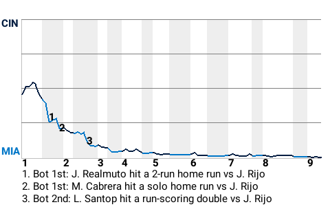 J.T. Realmuto took Cincinnati hurler Jose Rijo deep in the bottom of the first. His 2-run home run put the Marlins on top, 2-0. In all, Realmuto had 1 single in addition to the home run, while going 2 for 4.