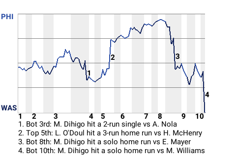 The Washington Nationals snuck past the Philadelphia Phillies, 6-5, in 10 innings. Washington center fielder Martin Dihigo, in particular, had a standout performance. With the loss, Philadelphia is 19-12.