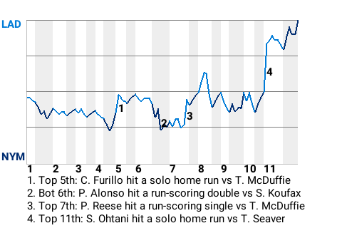 Los Angeles needed the clutch hitting of Shohei Ohtani to notch the win. The designated hitter hammered a solo home run in the top of the 11th inning to put the Dodgers on top, 3-2. For the game, Ohtani had 1 home run and 1 single in 5 at-bats.