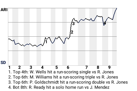 The Arizona Diamondbacks scooped up a win at Petco Park, dumping the San Diego Padres, 3-2. Jose Mendez, the 20th overall pick in the 2014 draft, was essential to his team's success. Mendez, now 2-4, was the winner. In 7.2 innings, he gave up 5 hits, while striking out 7, walking 2, and allowing 2 runs. The Diamondbacks, at 15-21, inhabit 4th place in the National League Western Division.