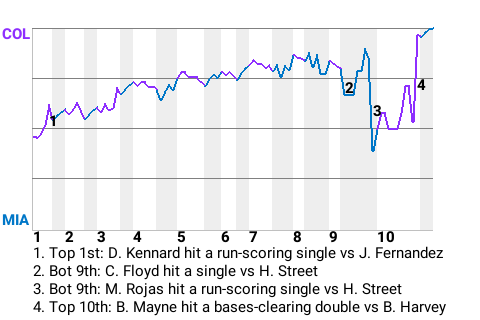 The Colorado Rockies picked up a win at Marlins Ballpark, taking down the Miami Marlins, 5-2, in 10 innings. On the mound for Colorado was right-hander Dick Redding. He played a central role in the triumph. Matt Belisle locked down his 1st save. Colorado has run its win streak to 5 straight.