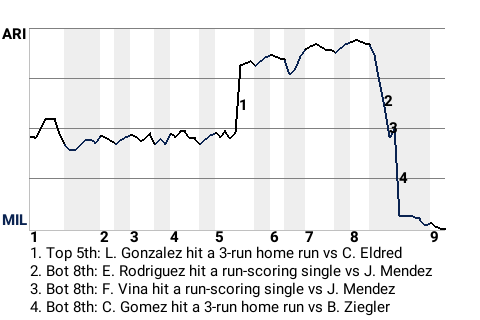 Milwaukee went in front, 5-3, on Carlos Gomez's 3rd home run of the season. The 3-run home run, which Gomez hit in the bottom of the eighth, left Arizona pitcher Brad Ziegler visibly perturbed.