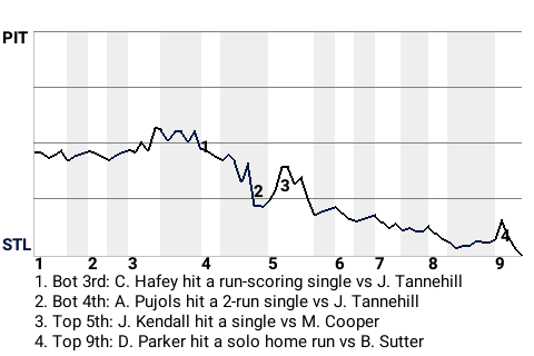 With two out in the bottom of the fourth, Albert Pujols put St. Louis in front, 3-1, with a 2-run single. The Cardinals went on to win the ballgame.
