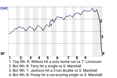 Chicago wasted an exceptional performance by pitcher Mordecai Brown, falling to the San Francisco Giants, 4-3. Brown threw 8.0 innings of shutout ball for the losing team. The win went to Johnny Antonelli in relief, making him now 2-0. Sean Marshall took the loss for Chicago. So far in 2014, San Francisco is 26-22.