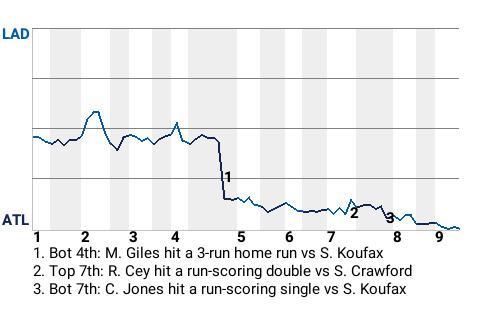 The Dodgers had been locked in a 0-0 tie with the Braves going into the bottom of the fourth inning. That changed quickly when the 25-year old second baseman Marcus Giles came to the plate. Giles hit a 3-run home run on a 1-0 curveball from Los Angeles hurler Sandy Koufax. It was Giles's 3rd home run of the year.