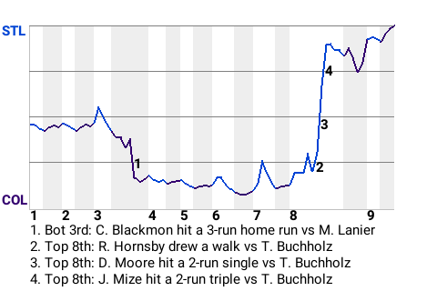 The St. Louis Cardinals besoiled an otherwise fine performance by Colorado center fielder Charlie Blackmon by beating the Rockies, 5-3, at Coors Field. Blackmon went 1-1 with a home run and 3 walks. He drove in 3 runs and scored once. The Cardinals are now 24-22, while the Rockies fall to 19-25.