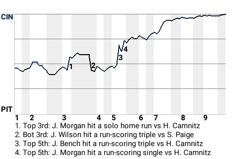 Cincinnati relied on the bat of Johnny Bench to get the win. The catcher ripped a run-scoring triple in the top of the fifth inning to put the Reds ahead, 2-1. For the game, Bench had 1 double and 1 triple in 4 at-bats.