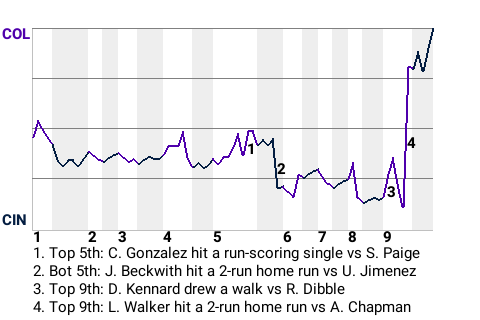 Walker had a timely hit for Colorado in the top of the ninth. With Colorado trailing 3-2, he turned a 1-2 fastball into a 2-run home run. It was his 5th home run of the season, making it 4-3, Colorado.