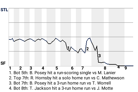 Buster Posey, who is rated as the 90th best prospect by BNN, took St. Louis hurler Todd Worrell deep in the bottom of the seventh. His 3-run home run put the Giants on top, 4-1. In all, Posey had 1 single in addition to the home run, while going 2 for 4.