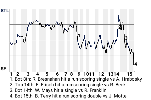 The decisive blow was delivered by Bill Terry in the bottom of the 15th when he hit a run-scoring double off 29-year old right-handed pitcher Jason Motte to win the game for San Francisco. The home crowd went nuts.