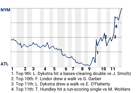 New York used the timely hitting of Todd Hundley to seize the win. The catcher stroked a run-scoring single in the top of the 11th inning to put the Mets on top, 4-3. It was his only hit in 1 at-bat, but it was a game-changer.