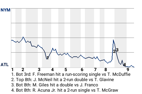 With two out in the bottom of the eighth, Ronald Acuna Jr. had a game-changing hit. The Braves designated hitter slammed a 2-run single off Tug McGraw, making the score 5-2, Atlanta.