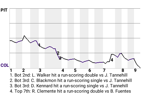 Colorado designated hitter Dan Kennard contributed a timely at-bat in the bottom of the third. With two down, he hit a changeup to center field for a run-scoring single. It was his 50th hit of the season and put the Rockies ahead, 3-0.