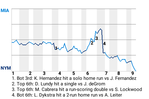 The Mets got a big hit from center fielder Lenny Dykstra. In the bottom of the sixth, Dykstra smacked a 2-run home run off Miami pitcher Al Leiter. It was his 3rd home run of the season. Suddenly, the Mets were ahead, 3-2.