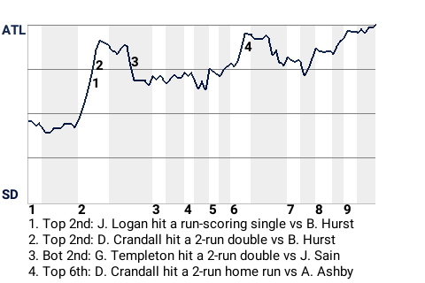 With Atlanta leading 1-0 in the top of the second, Crandall hit a fastball from Bruce Hurst for a 2-run double. It was his 1st double of the season and put the Braves ahead, 3-0.