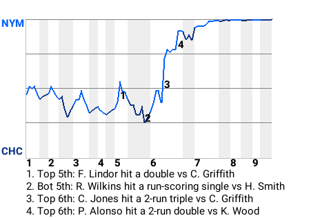 In the top of the sixth, the Mets grabbed the lead when Jones hit his 3rd triple of the season. The 2-run triple off Clark Griffith made it 3-2, New York.