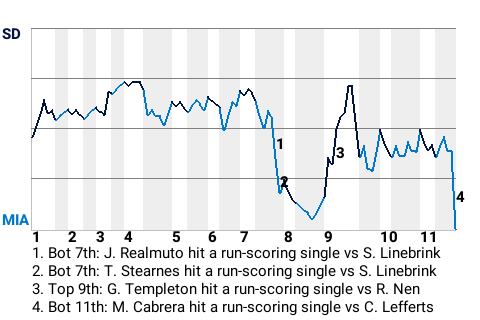 The Marlins got a clutch hit from pinch hitter Miguel Cabrera. In the bottom of the 11th, he hit a run-scoring single to right, to win the game for the Marlins.