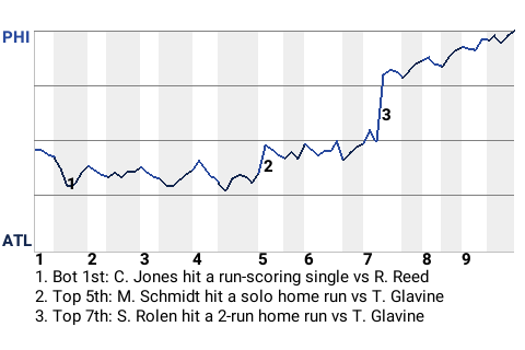 Rolen had a game-changing home run in the top of the seventh. On a first pitch sinker from Tom Glavine, he banged a 2-run home run to left, giving the Phillies a 3-1 lead. It was the 2nd home run of the year for Rolen.