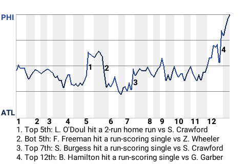 The Phillies beat the Braves in part due to timely hitting. Case in point: the two-out single Billy Hamilton produced in the top of the 12th. Batting against Gene Garber, Hamilton gave his team the lead, 4-3, when he hit a run-scoring single.