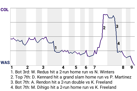 Washington went up, 7-6, on Martin Dihigo's 14th home run of the season. The 2-run home run, which Dihigo hit in the bottom of the seventh, left Colorado pitcher Kyle Freeland stewing.