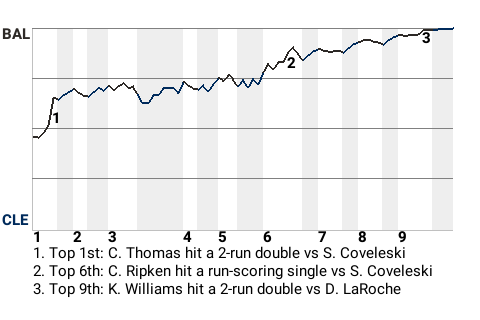 Riding the 3-hit performance of the 31-year old left fielder Ken Williams, the Baltimore Orioles stopped the Cleveland Indians, 5-0, in 9 innings. Webster McDonald earned the win to go to 3-1. He allowed no runs on 5 hits, with 1 walk and 5 strikeouts in 5.1 innings of work. Barney Pelty closed it out for Baltimore, earning his 1st save.