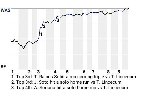 Tim Raines Sr hit a run-scoring triple off Tim Lincecum in the top of the third, which put the Nationals in front, 1-0. In addition to the triple, Raines Sr had 1 single and 1 walk, while going 2 for 3.