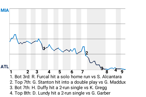 The Atlanta Braves topped the Miami Marlins, 6-2, with shortstop Rafael Furcal playing a big role. Furcal went 3-3 with a home run and 2 singles, while scoring 2 and driving in 2 for the Braves in the win. The last-place Braves now have a win-loss record of 26-35.